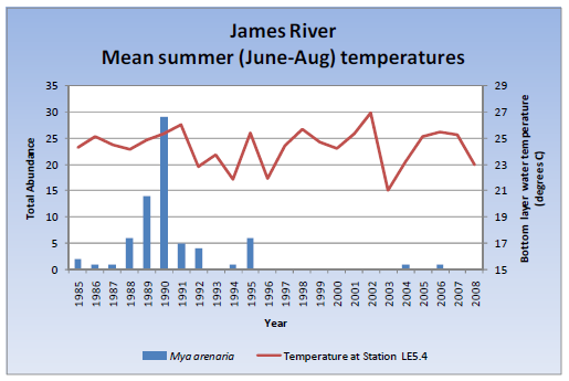 M. arenaria are temperature-sensitive and the southern limit of their range is controlled by the upper water temperatures. Temperature influences growth and reproduction. In the Chesapeake Bay, M. arenaria does not usually survive temperatures above 28 degrees C. High temperatures during the fall spawning season may be particularly harmful to the population. Ideal spawning temperatures range from around 10-14 degrees C in the spring (May-mid June) and 12-15 degrees C in the fall (late August-December). Data for populations are from Chesapeake Bay Baywide Benthic Datasets; data for water temperature are from Chesapeake Bay Institute Water Quality (1985-1982) and Chesapeake Bay Program Water Quality (1984-present).