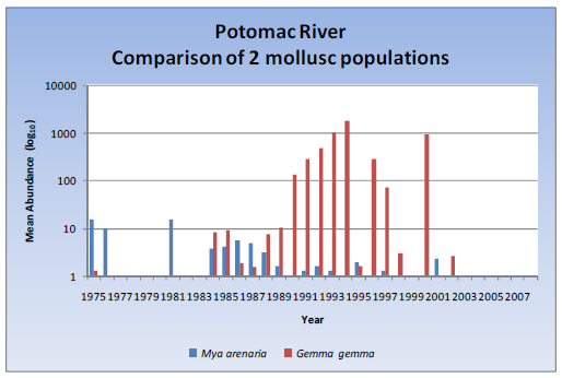 High water temperatures can result in thermal stress and decreased reburrowing activity. Studies have shown that as M. arenaria populations decline due to thermal stress, Gemma gemma populations increase. If G. gemma can establish a population in a newly vacated area, they could prevent the settling of future M. arenaria larvae, resulting in a change in population. Data for populations are from Chesapeake Bay Baywide Benthic Datasets.