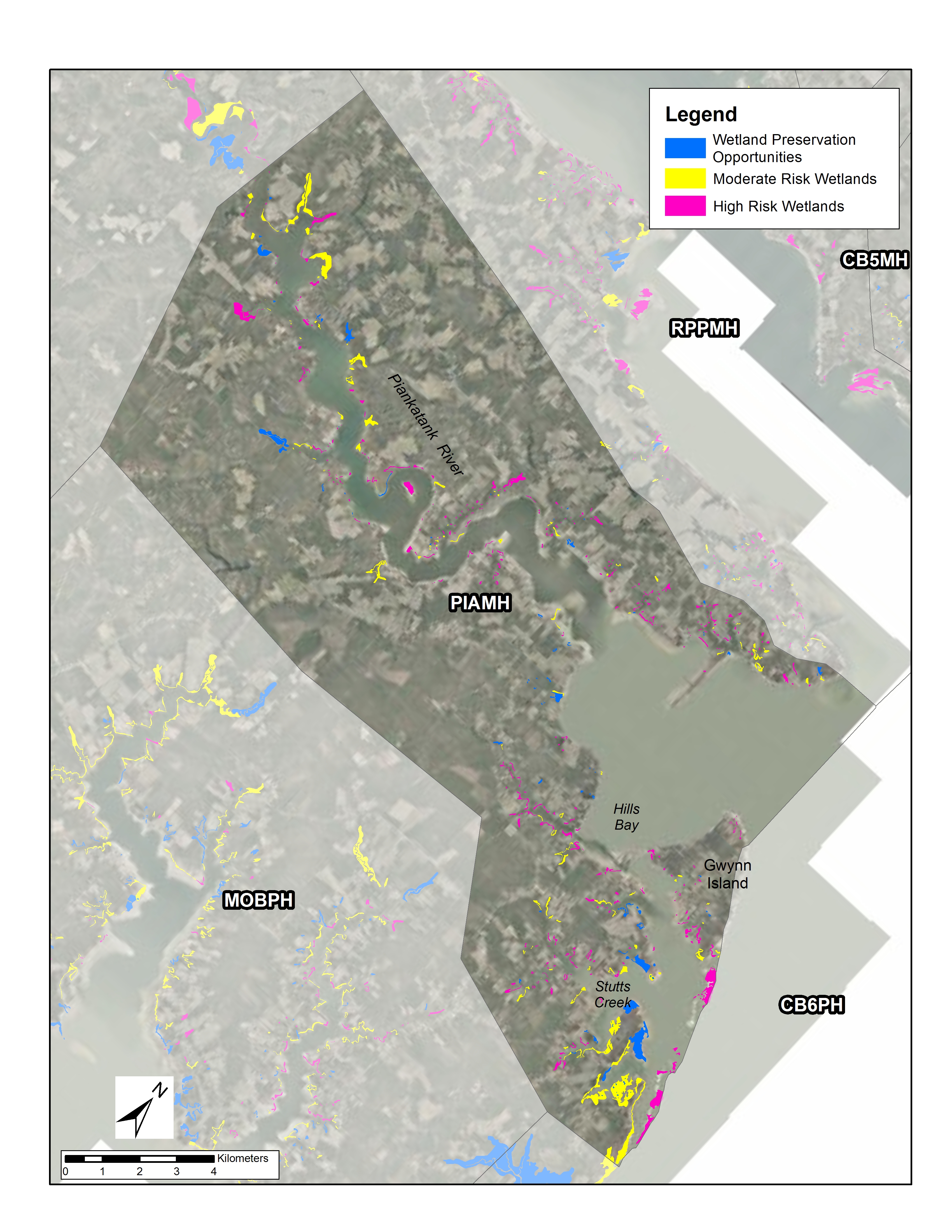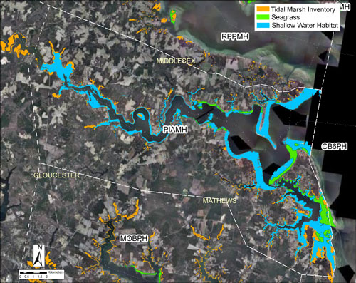 The Piankatank River is located in Mathews, Gloucester and Middlesex Counties and is predominantly residential in character. Much of the shoreline is developed (52% developed riparian lands and 20% hardened shoreline). All counties have moderate-high average annual rates of permitted shoreline hardening ranging from 1.3-1.7 km/yr (0.2-0.5% of the shoreline).