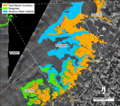 Shallow-Water and Tidal Wetlands- depiction of existing tidal wetland (vegetated & non-vegetated) and shallow-water habitat, with projected shifts due to sea level rise