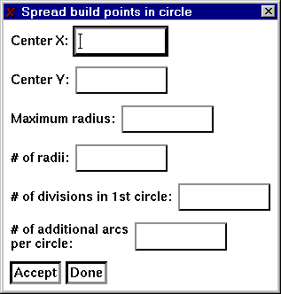 In the items Center X and Center Y enter the point to use as the center of the circle. Enter the maximum radius in the text item labeled Maximum radius. The item # of radii gives the number of divisions that will be made from the maximum radius. The next two items determine the density of points as the radii increases.