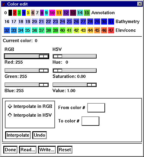 Use Undo to reverse the effects of Interpolate. Use Reset to set the colors to the start-up values. Read and Write bring up popups that allow the current colormaps to be read or written to disk. Use Done to close the popup.