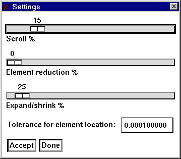 Scroll % sets the amount of movement for the arrow buttons located on the main panel. With the mouse, press on the hilighted bar while holding the mouse button down and move to the right (increasing scroll) or left (decreasing scroll). Changes in the position take effect immediately and affect the next and subsequent presses of the scrolling arrows on the main panel.