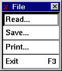 The pulldown menu File controls the reading/writing of data files (through two separate popups), printing of the drawing area, and allowing the user to exit ACE/gredit.