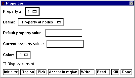 Select the number of the property to define. Use the item Define to select if the property is to be defined at the nodes of the grid, or at the elements. The Default property value is used to assign a value to all nodes (elements) for initialization. The Current property value is the selection that will be used in the Pick and Region operations described below. Set the color for the current property and toggle the display of the current values.