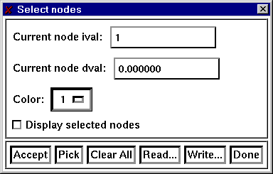 Click on Initialize to set the properties to the default value defined above. Use Region to define a polygonal region containing nodes (elements) that will be assigned the value of the Current property value. Use Pick to select individual nodes (elements). Accept region sets the property values of all nodes (elements) that are presently contained in the Region. Use Write to write the current state of the property values and Read to read in previously defined values.