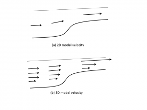 From a physical point of view, the 2D and 3D models behave very differently. Consider a straight channel with variable depths, with flow coming from deeper part and going into shallower part. Fig. 1 shows the side views of 2D and 3D velocities.